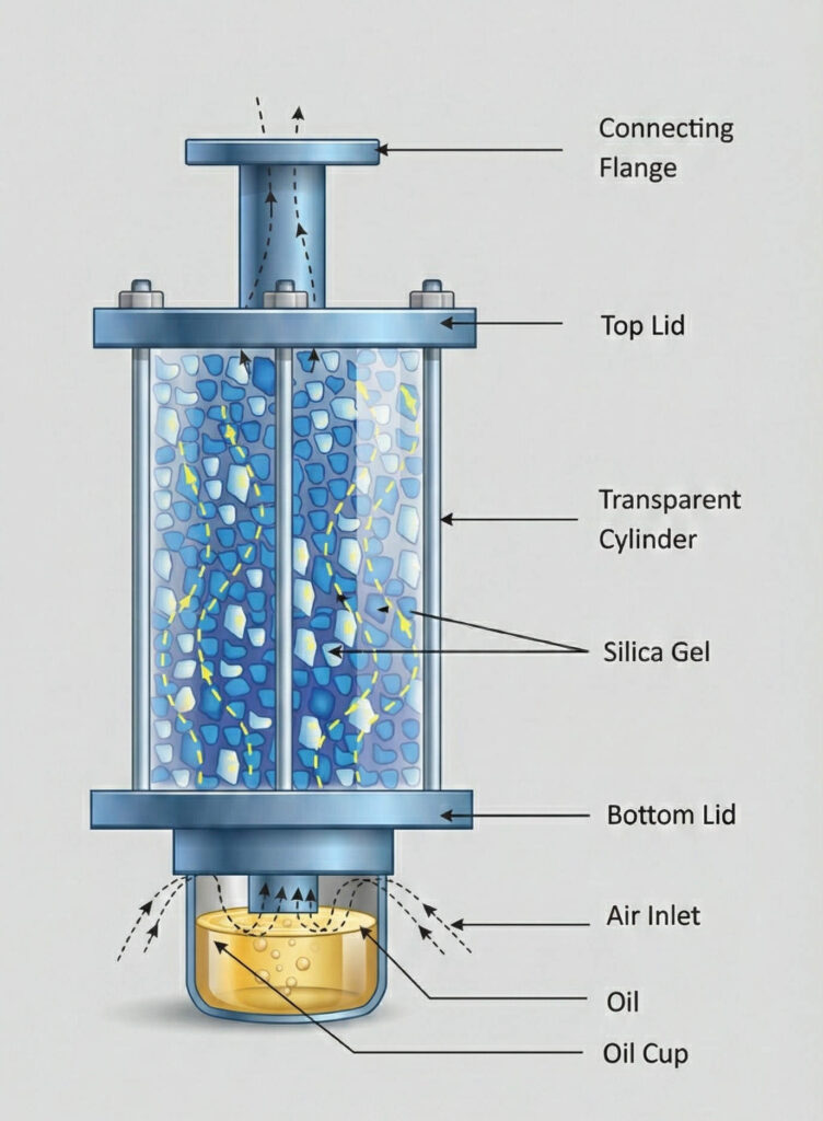 هنا بييجي دور الـ Silica Gel اللي موجودة جوه الـ Breather عشان تضمن إن الهوا اللي داخل ده جاف تماماً من الرطوبة