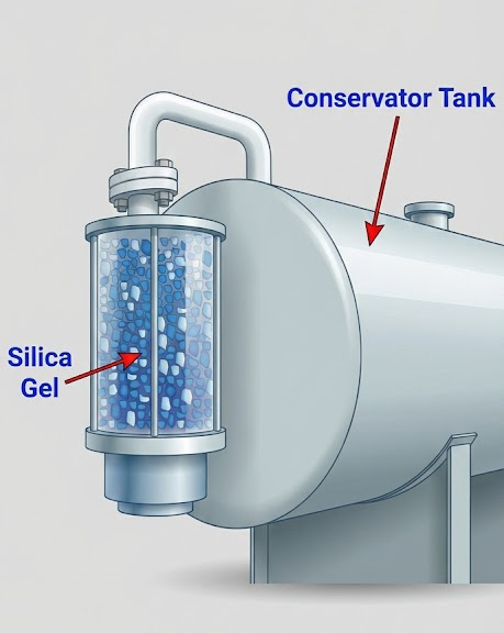في محطات المحولات، محولات القوى Power Transformers اللي بتعتمد على الزيت كوسيط تبريد وعزل لما الحمل بيزيد، درجة حرارة الملفات (Windings) بترتفع، وبالتالي حرارة الزيت بتزيد وحجمه بيتمدد. الزيت الزيادة ده بيروح فين؟ بيطلع على الـ Conservator Tank (خزان التمدد). هنا الهواء الموجود فوق سطح الزيت في الخزان بيخرج لبرا. والعكس بيحصل لما المحول يبرد، الزيت ينكمش ومستواه ينزل، فالمحول بيحتاج يسحب هواء من الجو الخارجي.